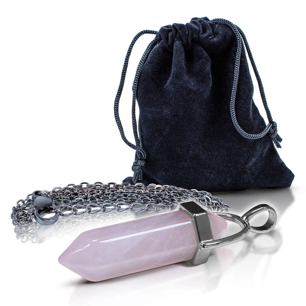 Formája: csiszolt rózsakvarc fémkeretben (lánccal), fekete tasakban csomagolva