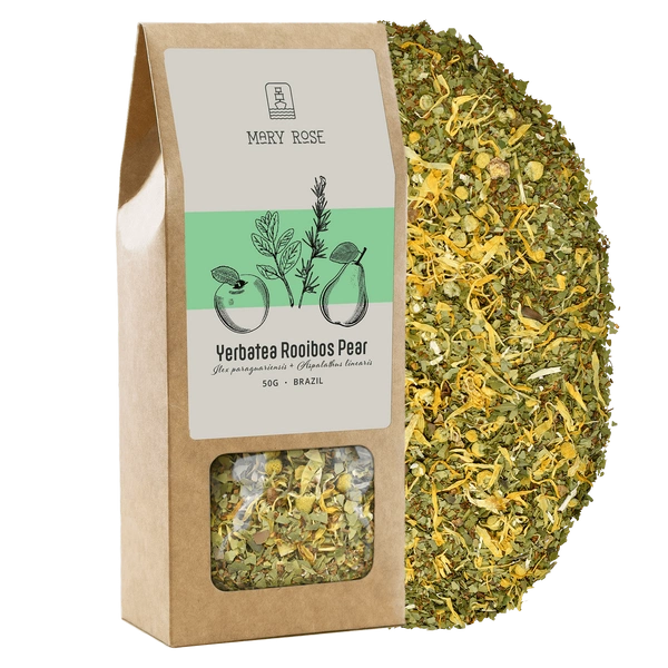 AMary Rose Rooibos Pear a friss, brazil yerba mate zöld és a finom rooibos ízét ötvözi, enyhén mézes ízjegyekkel. Bár a rooibos valójában nem tea - nem a teanövényből, a Camellia sinensisből származik -, gyakran a teák közé sorolják, sőt egyesek vörös teának is nevezik. Ez a rooibos levelek vörös színének köszönhető, amely itt az Ilex paraguariensis élénk zöldjével kombinálva rendkívül érdekes, színes kompozíciót alkot. A keverék lédús jellegét az aszalt gyümölcsök, például körte és alma hozzáadása fokozza, az egészet pedig a kamilla és a körömvirág szirmainak köszönhetően enyhén gyógynövényes jegyek teszik teljessé. A yerba mate és a tea kombinációja kissé gyengébb stimuláló hatással bír, mint a "teljes értékű" yerba mate. Ráadásul a rooibos híres arról, hogy koffeinmentes. A Yerbatea ezért ideális a kezdő infúziórajongók számára, akik még nem ismerik a yerba mate stimuláló erejét.